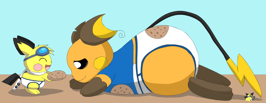 Commish of Sparks in his undies offers a cookie to Chip in his raichu form, since it looks like he couldn't get one while lying on his belly, probably after eating cookies before x3