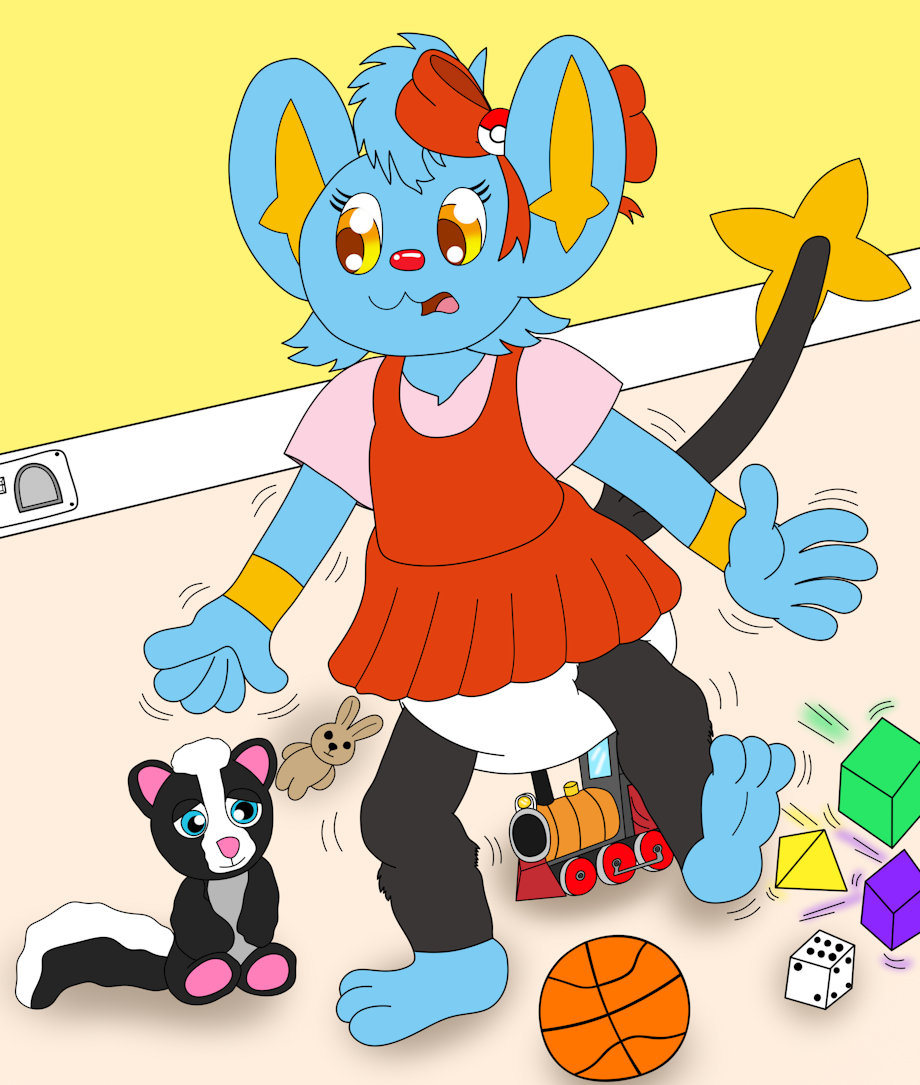 My half of an art trade with my friend lillilly who wanted to see her Pokemon OC Katie the Shinx who having just been transformed into an infant is struggling to walk and keep her balance.
