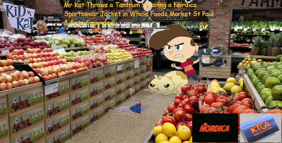 Coop Burtonburger and Mr Cheeks Grounds Mr Kat for Throwing a Tantrum Wearing a Nordica Sportswear Jacket in Whole Foods Market St Paul by Nordica Sportswear and KTCA Minneapolis-St Paul Created by Japanese PBS Grounded Pictures