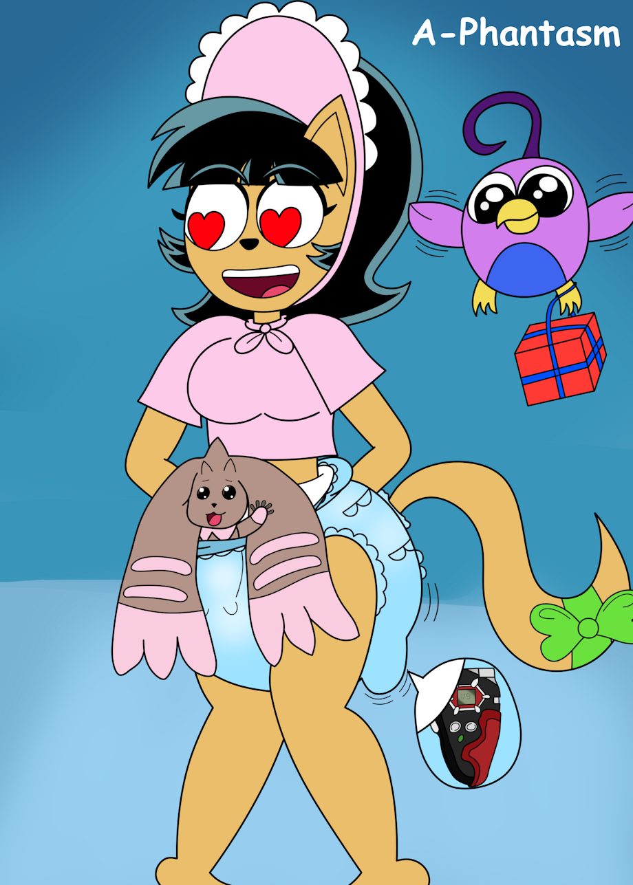 Since they like Lopmon and Kitty in her baby disguise, I thought I'd have the latter reacting in a similar way to that heart eyes cat emoji to see said Digimon popping out of her diaper's rubber pants, with that bird Tickle Wickle (from WolfDemon21's art) flying over to the camera with a present attached to his talons.