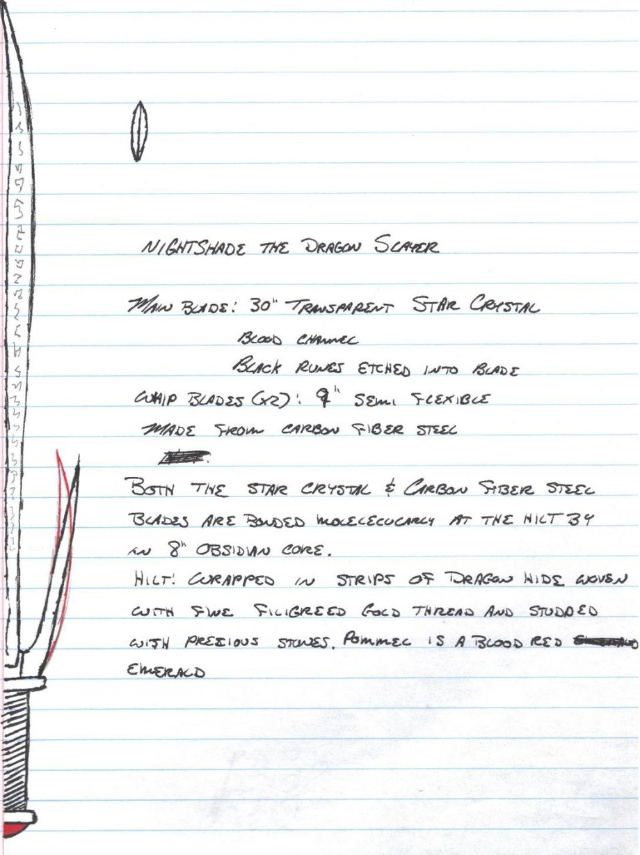 Nightshade is 30" long and 2.5" wide with barbed edges, the blade is forged from a clear Star Crystal with a faint blue tint, it has a blood channel running most of it's length with ornate black etchings on it as well, it also has two 9" semi-ridged forged metal whip-like blades flanking the main blade. With the hilt, the dirk is 38" long (the dirk can be found here: https://www.furaffinity.net/view/3614859/ ). The hilt is bound in leather with various small gems and filigreed gold thread woven in it and a blood red emerald set on the pommel, it also has a matching scabbard that leaves the whip blades exposed. Due to the inherent properties of the crystal, the blade can enhance Ainoko's powers fourfold.