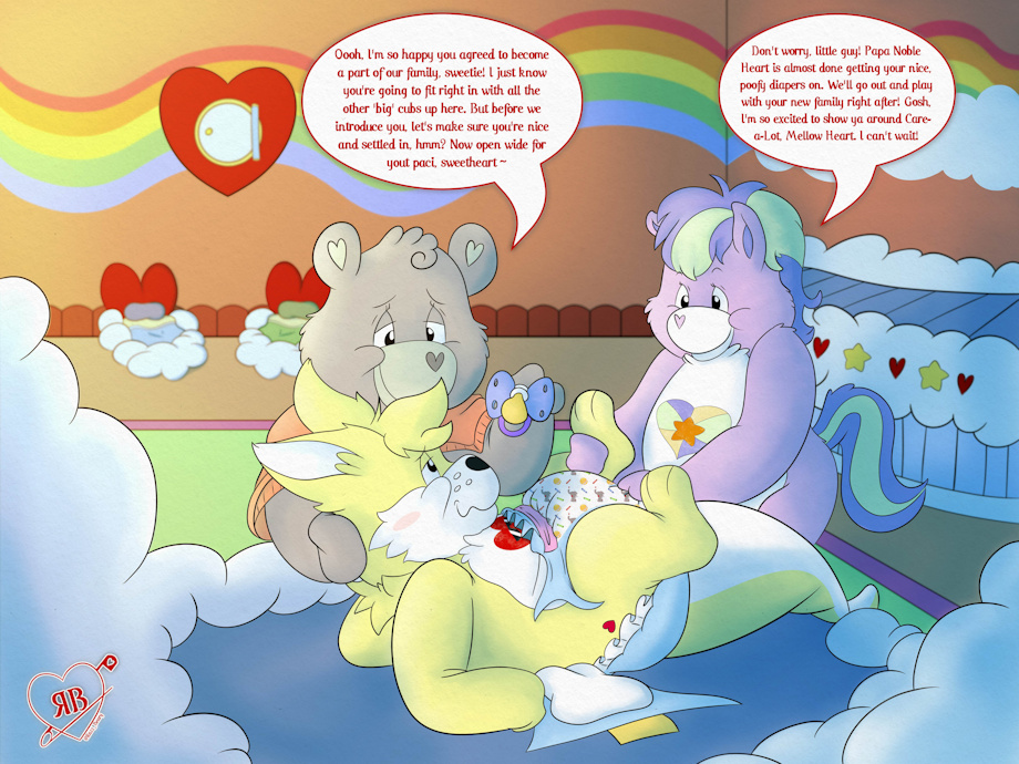 Of course, they couldn't show him around looking like he usually does, so the Care bears worked their magic and soon Fang had been transformed into a care cousin, Mellow Heart Doggaroo! In no time at all, he was whisked away to the Care-a-Lot nursery by Grams and Noble Heart. After all, every new cub and cousin in Care-a-Lot needed to be properly padded at all times! Even if they insisted they were actually 'big'~