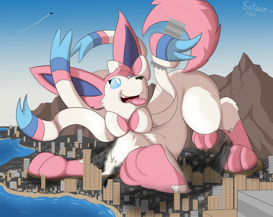 A huge sylveon decided to play with some building in city, fun fun fun for the playful fairy eeveelution~