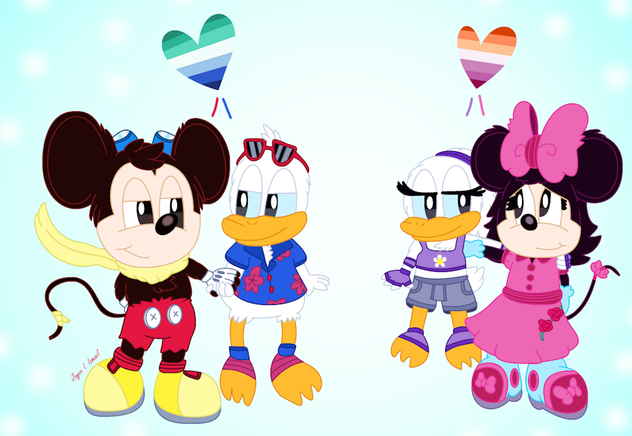 What if there's an alternate universe where Mickey and Donald are in a gay relationship while Minnie and Daisy are in a lesbian relationship? It'd certainly be interesting, but it's not canon anyway. 😅 -- Mickey takes cues from his first ever made cartoon: Plane Crazy. He is a veteran pilot in need of support after the war, since he hasn't seen Minnie in a long time.