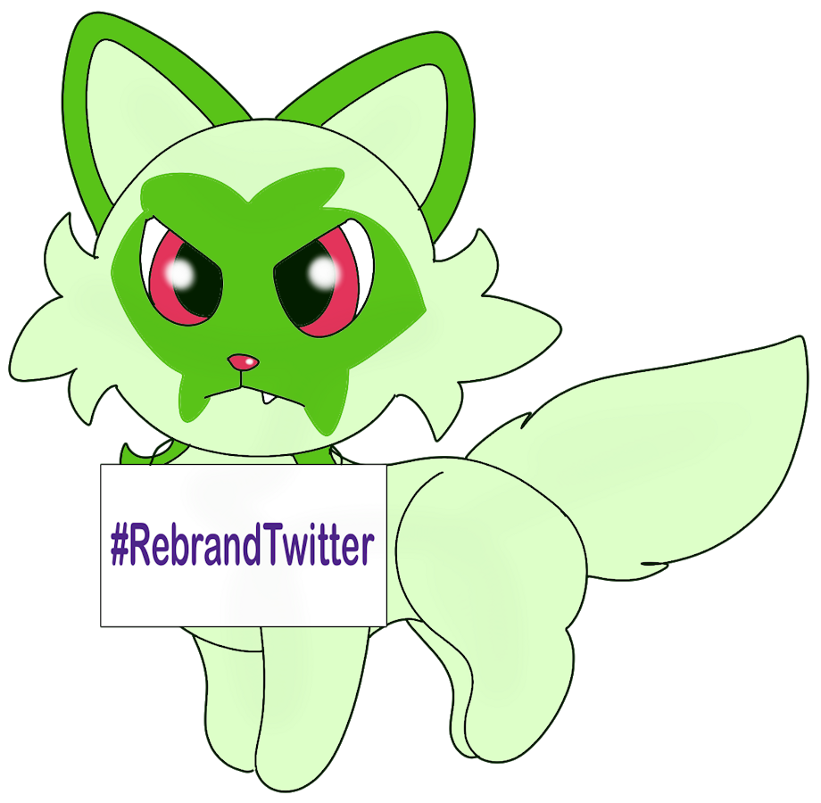 Sprigatito holding a Sign with a Purple Text, #RebrandTwitter