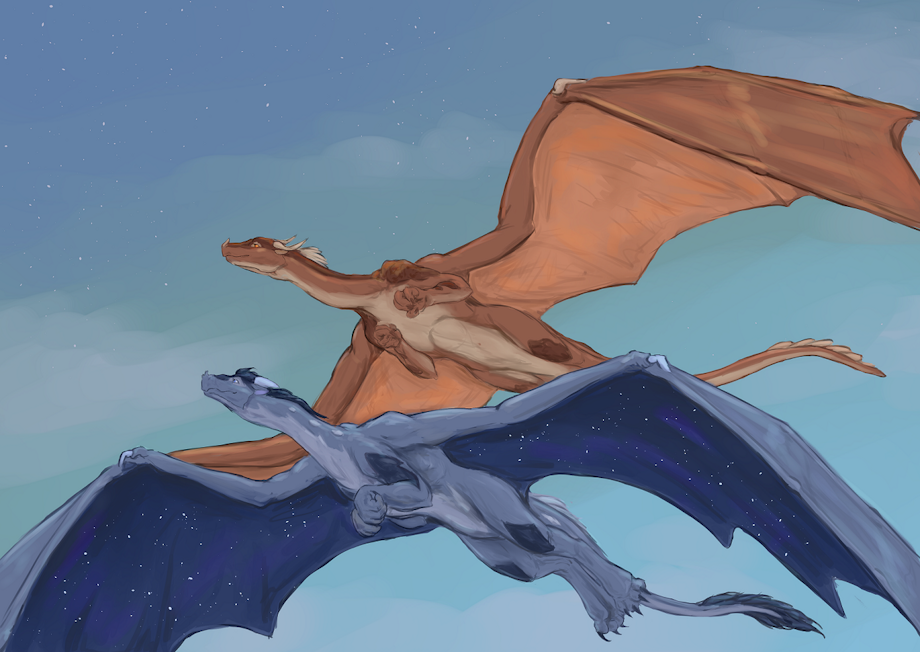 This will probably be my last artfight submission this year: featuring Fleef's characters Finch (brown & tan dragon) and Nova (shades of blue).