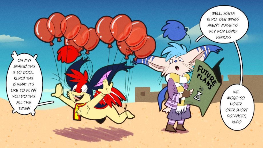 The balloons are very practical! But they might actually keep him afloat longer than the wings...
