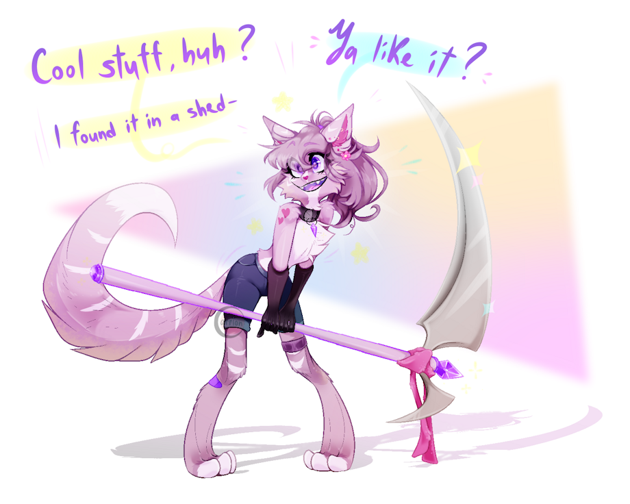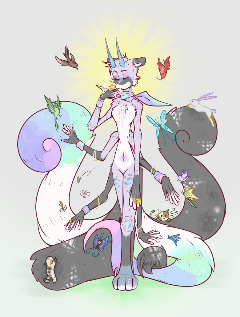 10 primary colors, 6 arms and 4 tails. She is mixed with a variety of animal families such as the jaguar, red panda, lynx and some Shiba Ibu dog.