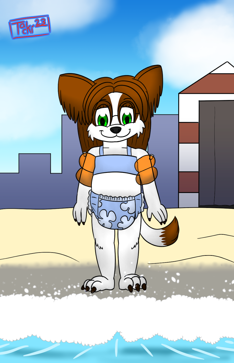 Emmy is standing in front of the ocean as a wave crashes in. A plain sandy beach is behind her, along with a red and white striped beach changing room and a far city skyline in the distance.