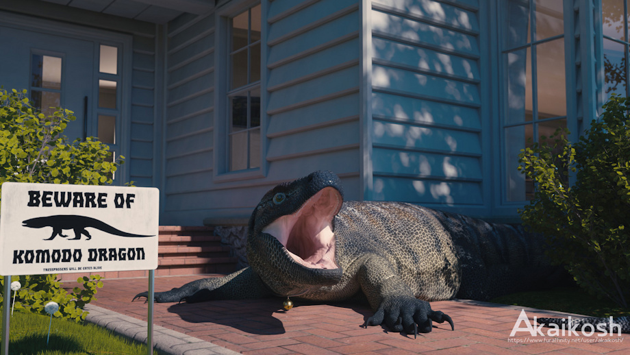 If "Beware of Komodo Dragon" wasn't enough of a tip, the "Trespassers will be eaten alive" line should spell it out for unwanted visitors. Unfortunately the text is rather small, and if you're close enough to make it out you're also close enough for Jillie here to devour. The last interloper to approach uninvited is still making her stomach rumble, the bulge in her midsection still occasionally twitching from her prey's futile attempts at trying to make her cough them up. A low contented growl emerges from the lizard's throat, truly enjoying the massage in her belly while she rested in front of the porch, soaking up the warm sunlight that would aid in digestion.