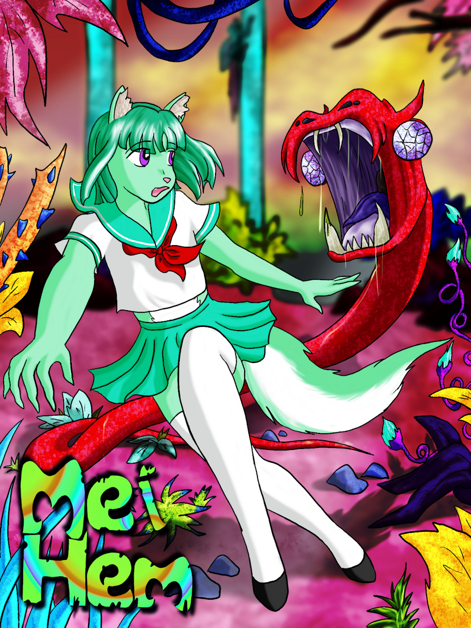 Mei Hem is a furry, fantasy adventure starring 19 year old femboy Mason "Mei" Hemming. As he tries to grapple with every day life, wondering who he is, he suddenly finds himself in a perilous, psychedelic fantasy world where he has to get to grips with a whole new identity beyond anything he could have imagined.