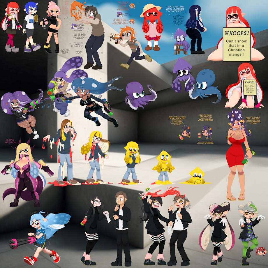 1º DismalDetractor got a pic of Kodainku and Kyuranto, characters from my recently released doujinshi, Dr. Squidlove. Koda really wants to hold hands, but aaah, she's so nervous, she's so nervous :3c 2º LyhokoLeaci got a pic of Octoling Yuuno, wearing the Agent 8 uniform. speaking in her own language, she's quite confident about her victory. 3º Jackson648328 got himself turned into a Octoling gal, by me :3c if he was good before she must be a lot better now :y 4º ijones12 got a canonically correct version of a scene from the doujin I recently released, Dr. Squidlove. The character Kodainku is in kindergarten at some point, and I drew her and her classmates fully humanoid, when character that young would be barely able to stand on wobbly limbs with no fingers, so [url=https://splatoonwiki.org/wiki/File:Inklingdevelopment.png]canonically[/url] this is how she'd have looked in that scene :y 5º infuscomus so I guess this is kind of a sequence to this and this, infus is in Squid Form about to accept the mission, in exchange for being squashed, but I have the suspicion those sweat drops aren't the result of concern. 6º theheroofdarkness got quite a bunch of things, the two lewd pics of characters Ika-Ai and Kodainku from my recently released doujinshi, Dr. Squidlove. to the right of the canvas which as I mentioned above are censored but can be checked in my discord. I'll write a better description once I make the separated versions. Hero also got two lil' scenes serving as a sequel to this. Showing both of us having fully embraced our new forms while engaging in some splat fun with viperwing. The second pic has us in the same poses, but in our Squid/Octo Forms. 7º May-Marzo got a pic of their Jabberwocky OC, transformed into an Inkling, her dragon mouths transformed into Dual Splaties, and I guess some of her bodyfat redistributing now that she's in a smaller body. 8º ijones12 got a 5 step sequence transforming into an infant inkling, using red and white ink as a callback to the Ketchup vs Mayo Splatfest. Like the other picture, [url=https://splatoonwiki.org/wiki/File:Inklingdevelopment.png]canonically transformed.[/url] 9º wakeykun got their OC Claire, in her party girl form, just chugging down the ink because of course she mistook it for a drank. Thus transforming into an Octoling. 10º Malkaiwot simply got a pic of himself freshly transformed into a fresh inkling girl carrying a Splatling, due to the motion lines and her expression you can see this has literally just happened :v 11º 7Tsuki & Bittersweet got a lil' sequence showing Tsuki making Bitter sign a suspicious contract, which of course results in both of them getting transformed, into the Squid Sisters! Callie and Marie! Ready to sign on stage as soon as the transformation is done. Bitter also got an emoji of Octoling Aurora Dawn, which you can see at the bottom right of the page.