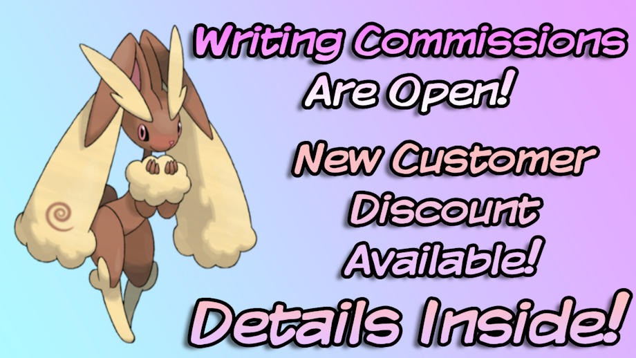 I’m currently offering a discount to new customers! If you’ve never commissioned me in the past, and you commission me now, you can get your first story for $45 per 1k words! And, if you commission two stories, or get a story with multiple chapters or parts, the first story/chapter/part will be only $40 per 1k words!