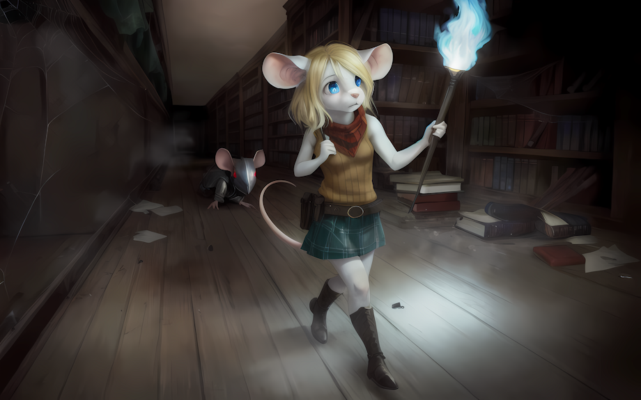Primary Prompt: Furry, Anthro, mouse, white fur, white colored fur, blonde hair, blonde colored hair, red scarf, green plaid skirt, ((orange sweater)), holding torch, torch, blue fire, blue colored fire, library, bookshelf, books, wooden floor, spider web, suit of armor, blue eyes, fear, scared nervous, shy, cute, shock, ((Resident Evil 4)), Ashley, tiny, small, smaller female, medium breasts, small female, large room, size difference, huge room, paper, brown belt, belt buckle, paws, boots, walking, clenched hand, followed by monster, monster, monster in shadow, monster on background, Las plagas, followed by suit of armor, followed by Las plagas, mist, fog, scary, cold, monster with glowing red eyes, match, ((holding match)), matchbox, blue matchbox, reflective floor, dusty floor, ((pink mouse tail)), followed by bug, followed by creature, followed by bug creature, all fours, crawling, knight, followed by knight, sleeveless