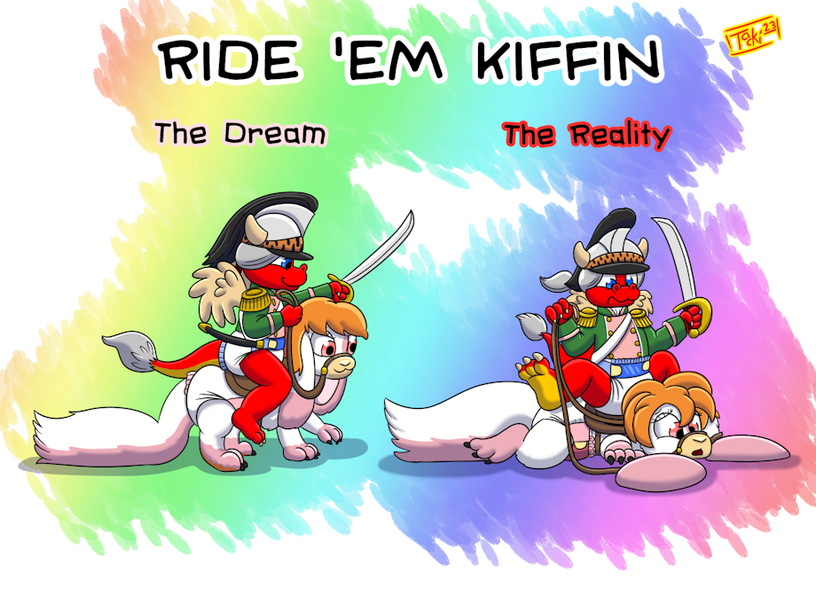 Tacki, in full dragoon's uniform is riding a saddled Kiffin like a horse. On the left side is the dream, where Tacki is actually riding her successfully. On the right side is the reality, that Kiffin is too small, and Tacki is too heavy! Welp, back to the drawing board!