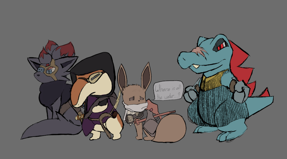 characters in a dnd game i'm in. a noble in exile, a battered mystic warrior, a trap tripping sneak theif, and the poor loaf who woke up to the hellworld he lives in now.