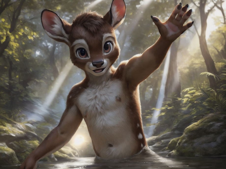 Positive Prompt: male, solo, (((cub, young, child))), ((((anthro)))), bambi film, hyper realistic, realistic fur, sheath, forest river, light brown fur, [white spots], hooves, sun rays, (((reaching towards viewer))), friendly expression