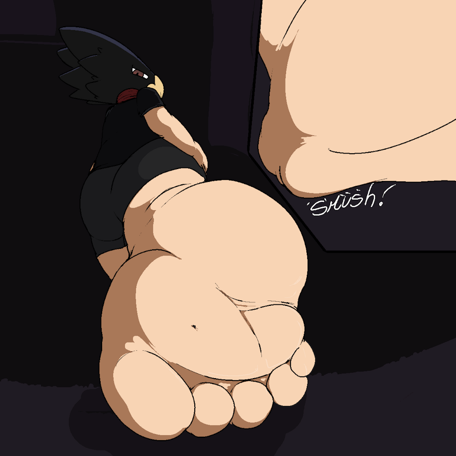 Haven't been here in a bit and what do I see but you drawing that gosh darn hottie Tokoyami Fumikage again. -///- This angle is so hot. I adore how the first panel is with an intense close up to the back of the teen's plush foot ball. The mid stepping process as he smushes a puny speck to his plush, doughy foot is ravishing. The ball of his foot colliding against the ground, that part of the sole flattening as his body weight focuses on one point, his foot as it flattens against the ground and then starts to lift off midstep by his bulbous toes~ The onomatopia enhances this show too, as the smush means that the micro being squashed was a direct hit. He doesn't even realized he stepped on someone, just 'feels' like he stepped on something with his chubby feet. The bug down there most likely crying for help as Tokoyami stays in mid step for a moment, squinting his eyes as if pondering if he stepped in something, ignores the feeling and shall continue his treading momentarily. Due to the darkness of the area he's in, this makes me think this is happening in his dorm room. Where nothing can stop this small mite from being trampled on as he explores his room, or even walks into the dorm hallway for something. His barefeet slapping into the floor of his hard floor room, making pattering sounds as the micro is pressed down flat right along with the bird head's sole as it flattens against the floor. <3 Gosh I wish that were me. -////- This is such a great angle, making him look utterly titanic as the micro is so small that you can BARELY see its form. His foot is extremely wide and chubby, ensuring that with enough steps, the micro shall sink deeply into the folds of his sole, never to be heard from again from their micro buddies as the bug is lost in a cavern of sweat beads and encroaching, ever morphing walls of flesh. Lovely~