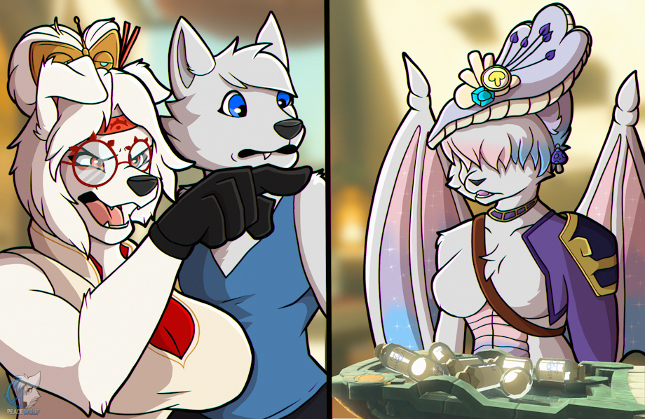 Shaded commission of what I can only describe as an interesting confrontation. xD *checks notes* Purah (as a furry) is upset with Raimyah (a streamer buddy of mine) because they wouldn't stop throwing milk at her in Tears of the Kingdom. Peace is in the background unsure of what to make of the situation.