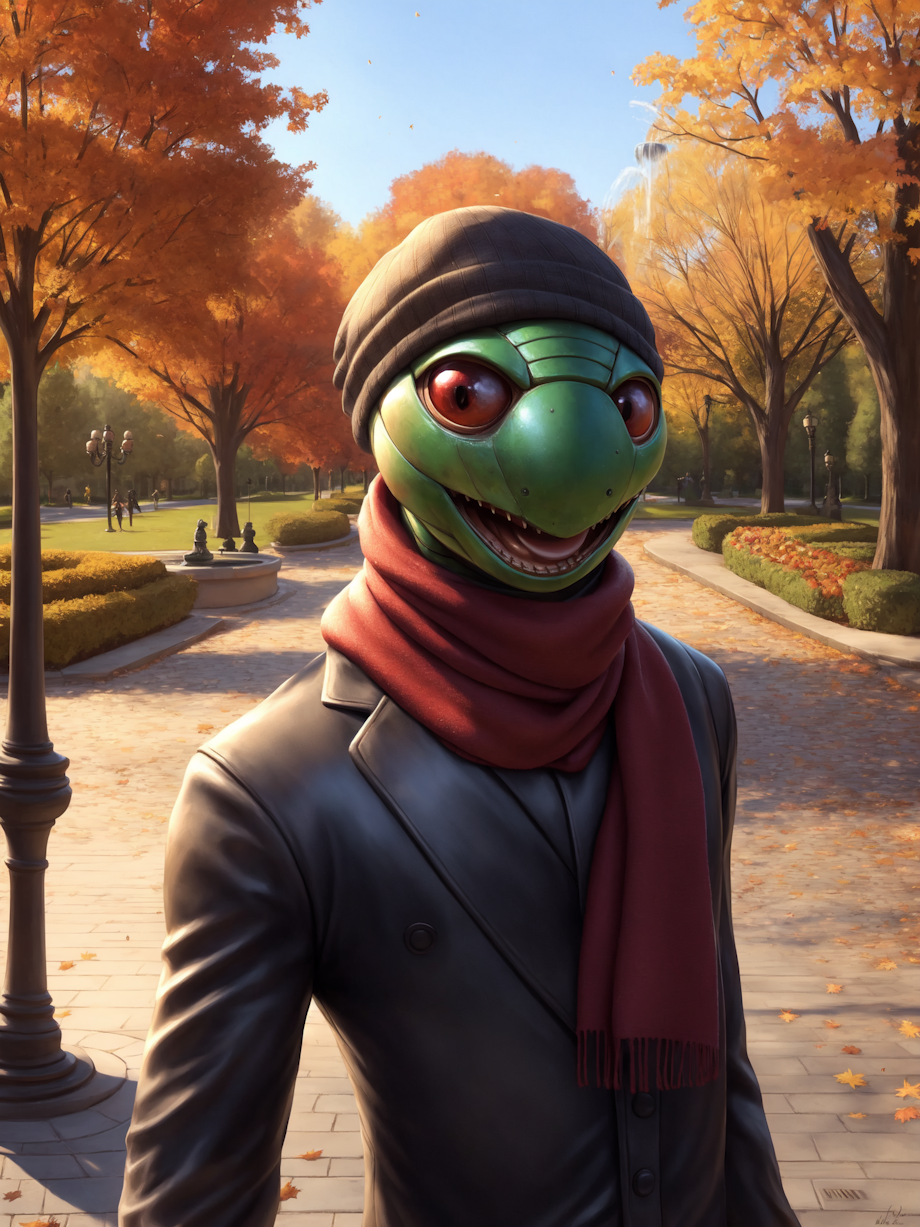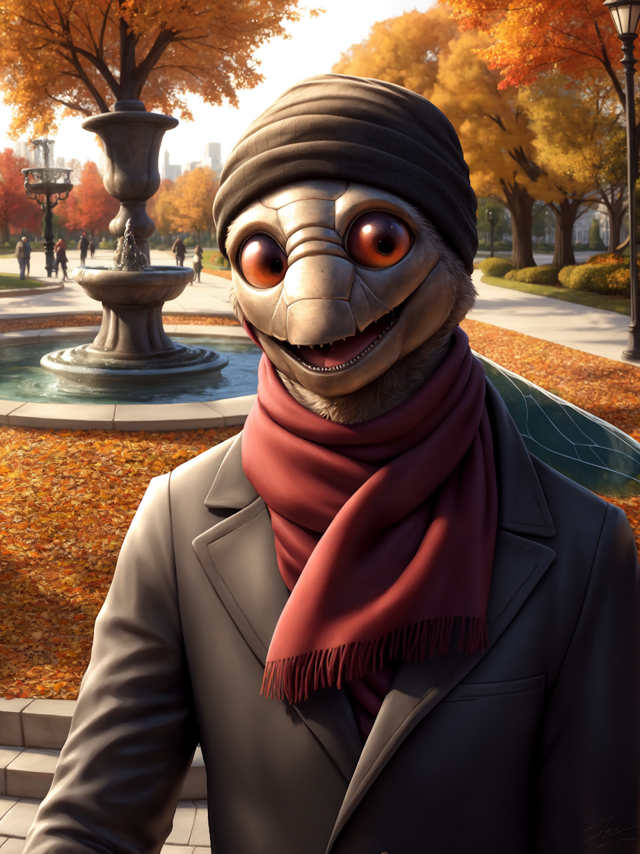 male (bug fly, insect, arthropod, dipteran:1.2), anthro, fully clothed, scarf, beanie, open mouth smiling, (bug eyes:0.5), (red eyes:0.7), handsome, (cute:0.3), public park, trees, fountain, sidewalk, winter,