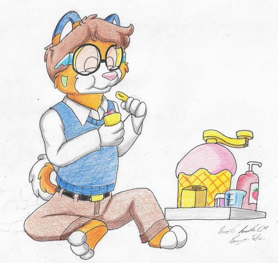 Snowy enjoying some ice cream he made on his ice cream maker toy.