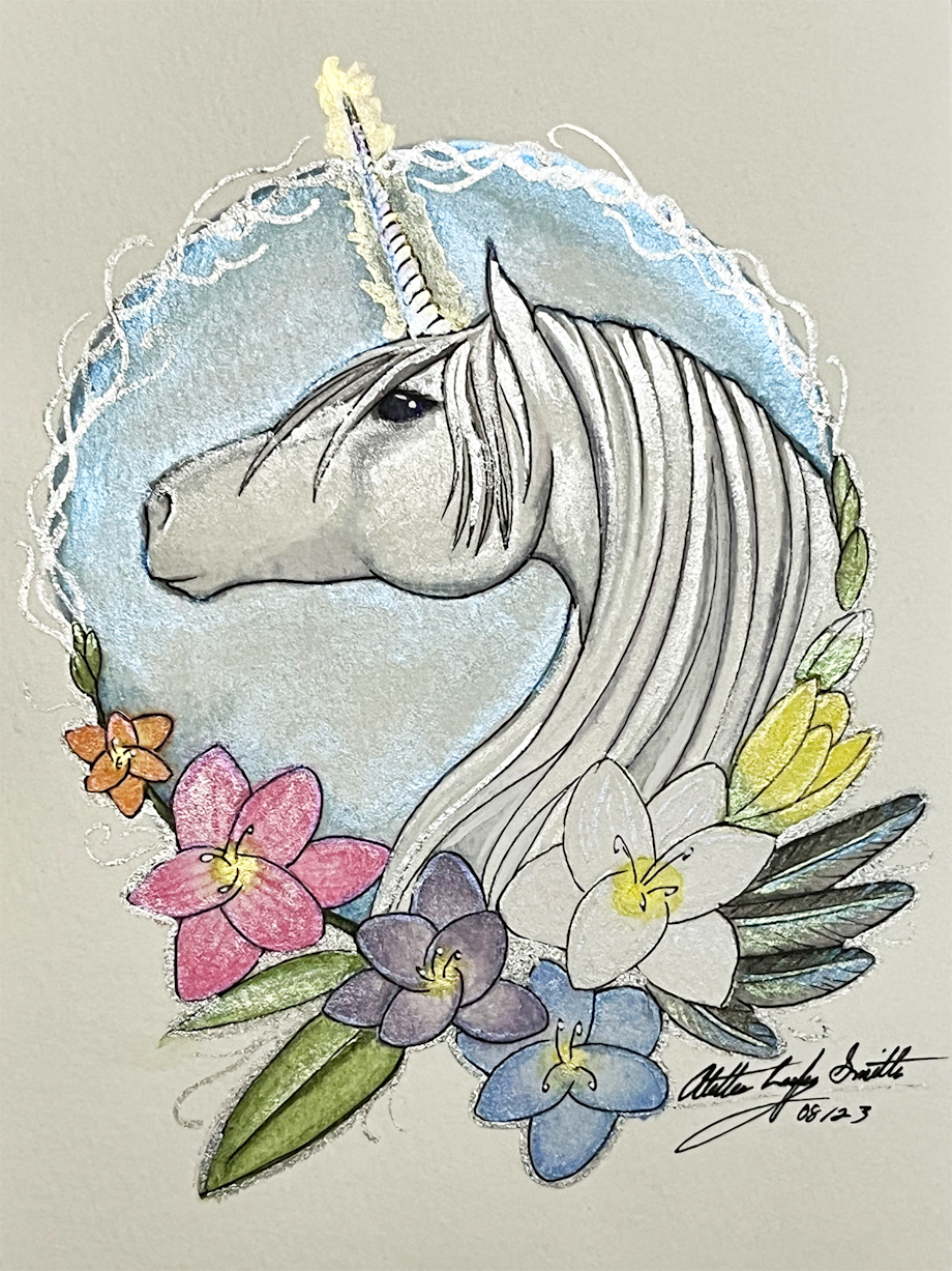 I've been trying to dabble in more traditional media lately, and I'm quite proud of how this one came out! He was done in mechanical pencil, Arteeza watercolors and Copic fine liner, finished with Koi, Van Goh, Shinhan and Fine Tec watercolors and pigments with white highlights added with Kuretake ink pen. I had entirely too much fun adding the colored metallic paints to the flowers and then figuring out what other ways I could apply them to the painting. Original is 6"x5" and done on hot pressed watercolor paper. I'm debating doing a limited run of embellished, matted, prints of him for $60 plus shipping. However he is for sale for $200 as I don't really want to part with him lol.