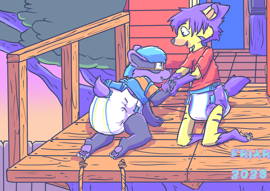 Illustration of Everett the wet and messy diapered badger being helped up onto his feet by Jesse the diapered hyena on the porch of the treehouse, in front of the rope ladder.
