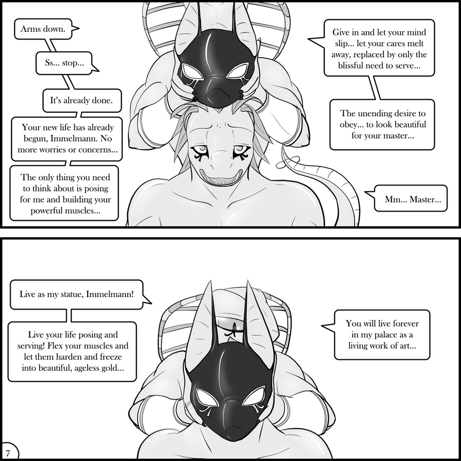 In the second-to-last page of the comic, Immy has lost and is fully succumbing to the naga's powers. His body stiffens into a glossy, golden statue, posed for his new master's amusement. The anubis mask seals itself permanently to the dinosaur's face and skull, seeping deep into his mind.