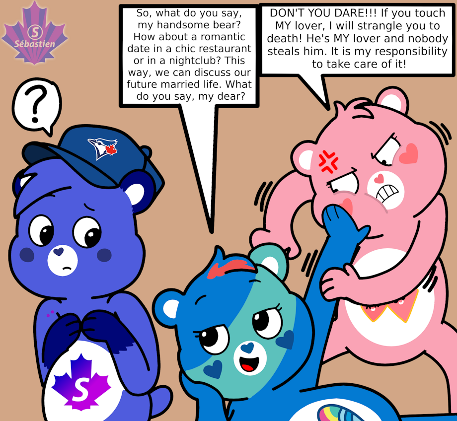 It's about a love fight to steal Creative Bear's heart between Love-A-Lot and Ocean Breeze Bear and apparently Love-A-Lot looks super enraged because he's her lover and no one should steal his love side.