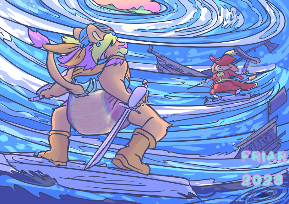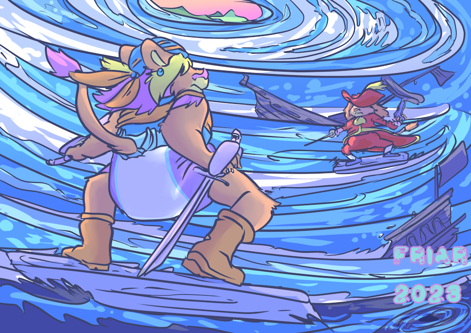 Illustration of a pirate version of Friar dressed in a messy diaper, boots, striped shirt and striped bandanna and earrings dual wielding swords facing off against his doppleganger, a red coat and hat wearing lion obscuring his diaper that is wielding a rapier and flintlock pistol. Both lions are afloat boards of wood on opposite sides of a whirlpool, with shattered pieces of a pirate ship in the vortex. A placid mountain and sky are seen at the top of the vortex.