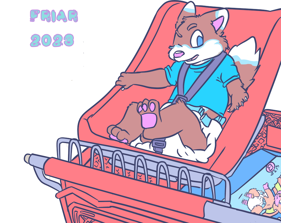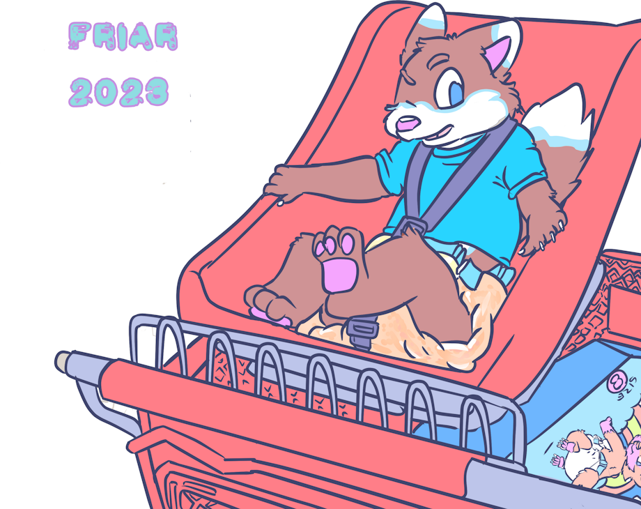 Illustration commission of Andy Aloysius the foxcollie seated in a shopping cart baby seat, filling his diaper while in the diaper aisle. Pusheez brand diapers featuring a fox kit in a diaper are displayed on the shelf.