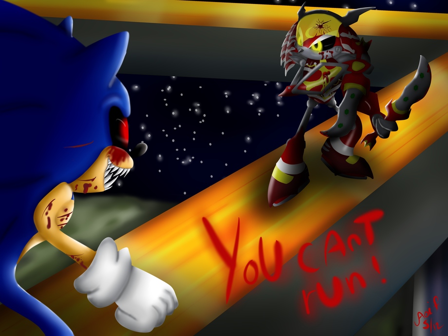 This Drawing was a suggestion/challenge/Gift art/I dont even know. All I knows is one of my good buddies said I should draw Sonic EXE in a fight with his creation Metal Knight Knux on top of Meteor Herd. So I spent several hours working on this >:C