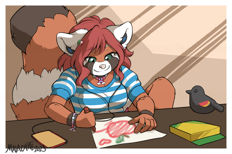Aw, this is lovely. The idea of doing slice of life 'photos' like this is really cool, and I do like how this piece focuses on character and story-telling over other considerations. It's such an adorable scene, too. I love the charm bracelet and necklace and the little strawberry hair clip. And it's such a lovely idea as well. While I tend to use other methods to decompress, it does look like a fun way to do it, and being able to allow yourself to just create, and to heck with "getting it right" can feel so, so good. Fantastic stuff, and it's always a treat to see more of Mal!