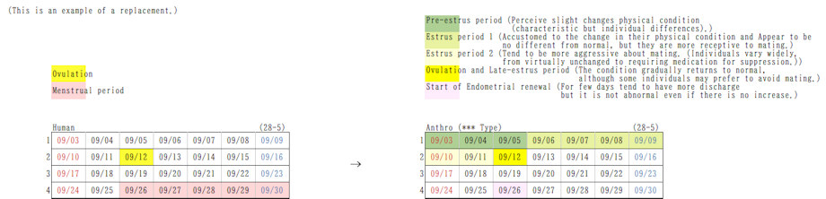 I've been thinking about the position of the different things (menstruation and estrus) and the things that tend to cause trouble, assuming that the mutual sexual cycle is the same, and organizing them into a chart.