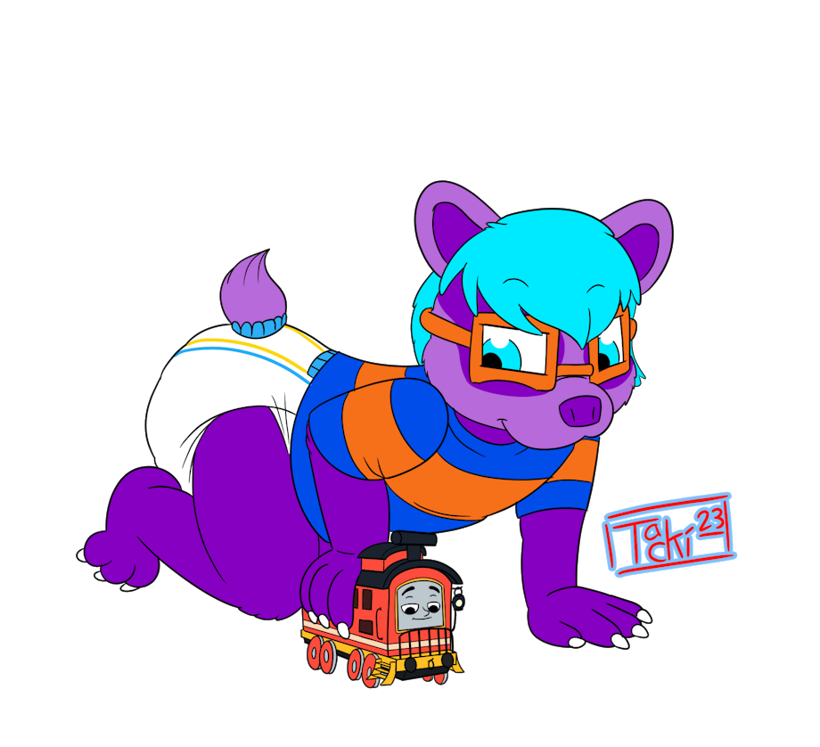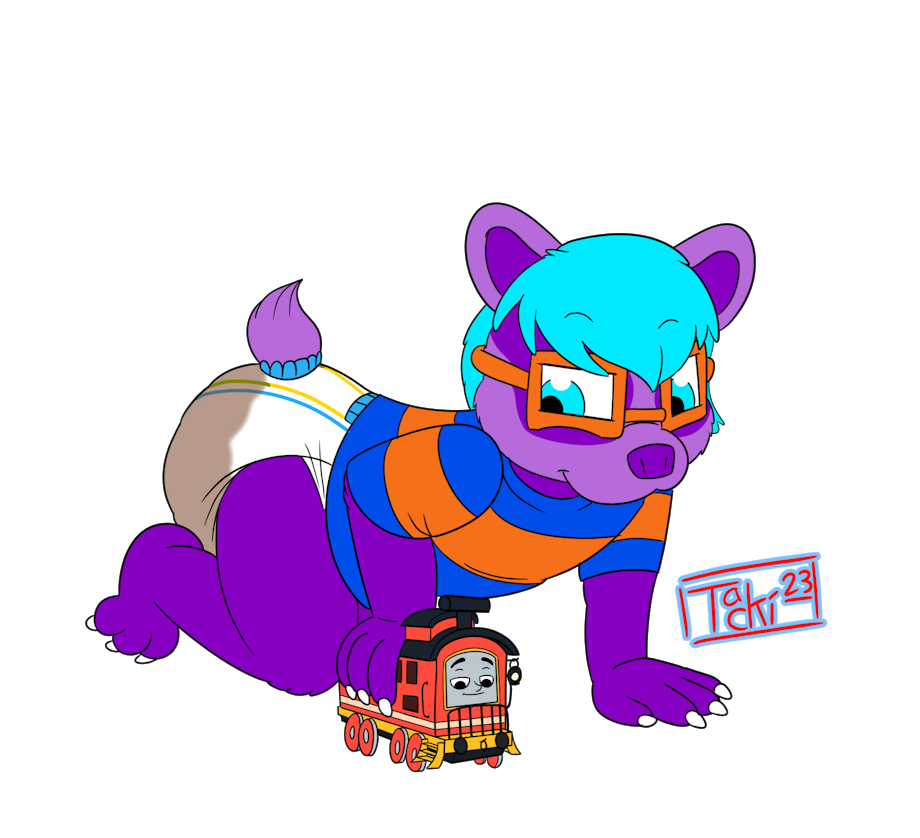 Everett the Purple Badger is playing on the floor with a Bruno the Red Caboose toy. Everett has neon blue thick hair and purple fur. His eye color is the same color as his hair. He has darker purple badger markings around his eyes and the inside of his ears. The rest of his visible fur is the same dark purple. He’s wearing his thick orange glasses He has his blue shirt with an orange stripe on. He’s wearing a white disposable medical diaper with blue and yellow wetness indicator.