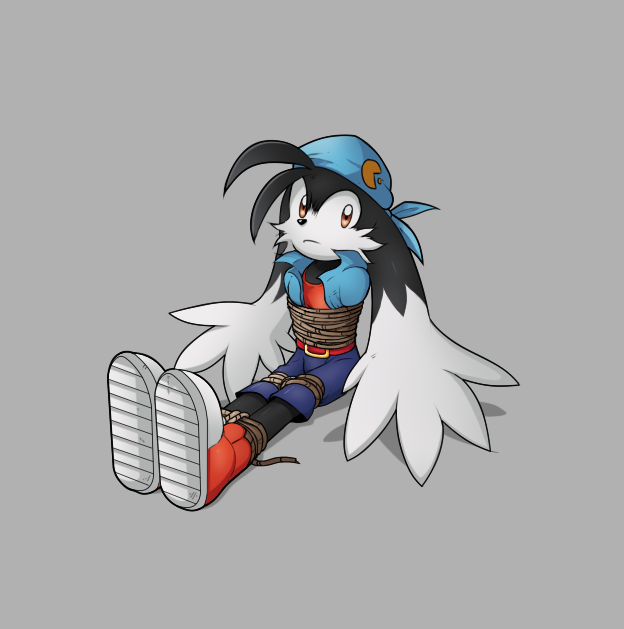 Klonoa was unlucky enough to get captured and tied up by gangsters. They tied his arms behind his back with a rope, tied his ankles together with a rope, tied his upper legs with ropes, then tied another rope around the body. They stole his Wind Ring and they took him to their hideout. He was then placed in a old empty room, and had to be fed decent food every day. The gangsters were planning to make a profit out of him, much to Klonoa's dismay. But still, he hopes he will be rescued from his kidnappers.