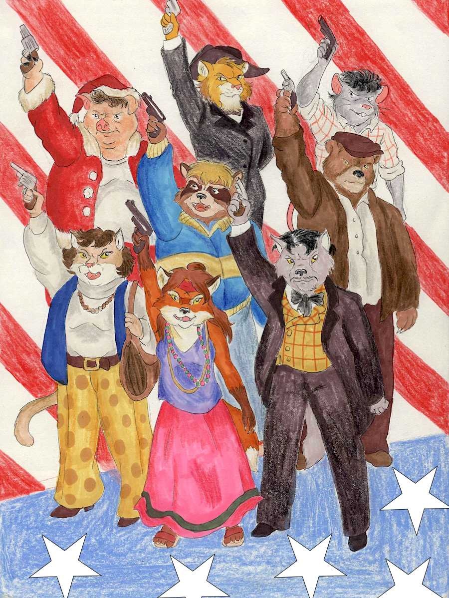 Something I did in honor of the late Stephen Sondheim's 90th birthday. After seeing a former classmate play John Wilkes Booth in a local production of his dark musical 'Assassins' I started drawing an anthro version of the cast, and it turned out fairly well. The musical looks at the lives of nine real-life presidential assassins, and it is not meant to celebrate or excuse their actions (and neither is this pic) - it's meant to be an examination of the dark side of the American dream and how it can also inspire dark actions in disappointed people.