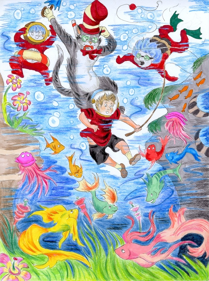 In one of the best songs from Seussical the Cat in the Hat invites Jojo, the dreamer son of the Mayor of Whoville, to imagine being under the sea. I am indebted to the Dr. for his visual cues on drawing water.