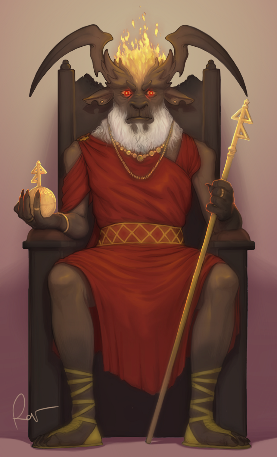 This time I was commissioned for a royal character connected to the fire element. The suggestions were about the classic FinalFantasy Ifrit design for some horns and I also dropped in some influences drawn from the Major Arcana tarots - The Emperor and The Devil, specifically. I also wanted to give him an older appereance, like an old shriveled king with a still fiery heart! I really hope you like this :)