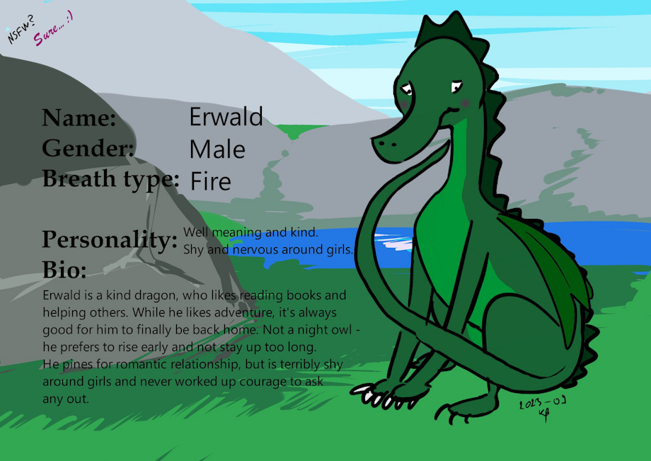 Erwald is a kind dragon, who likes reading books and helping others. While he likes adventure, it's always good for him to finally be back home. Not a night owl - he prefers to rise early and not stay up too long.