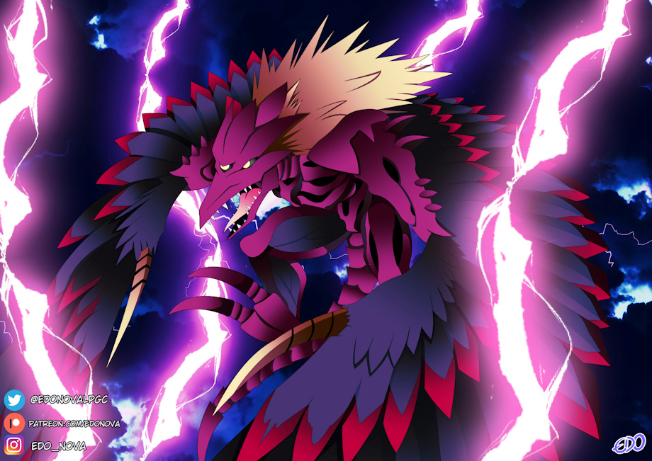 Especialmente a mi, no me gusta su diseño, entiendo que intenta imitar a Hraesvelgr, gigante de la mitología nórdica que tenía la capacidad e convertirse en un gigantesco águila, aunque el concepto ha sido tomado más recientemente con Frosvelgrmon, que tiene más relación con la mitología, pero es que a mi… a mi me parece una quimera o un ser sin un concepto concreto, solo necesitaban un bicho intimídate que representase la oscuridad.
