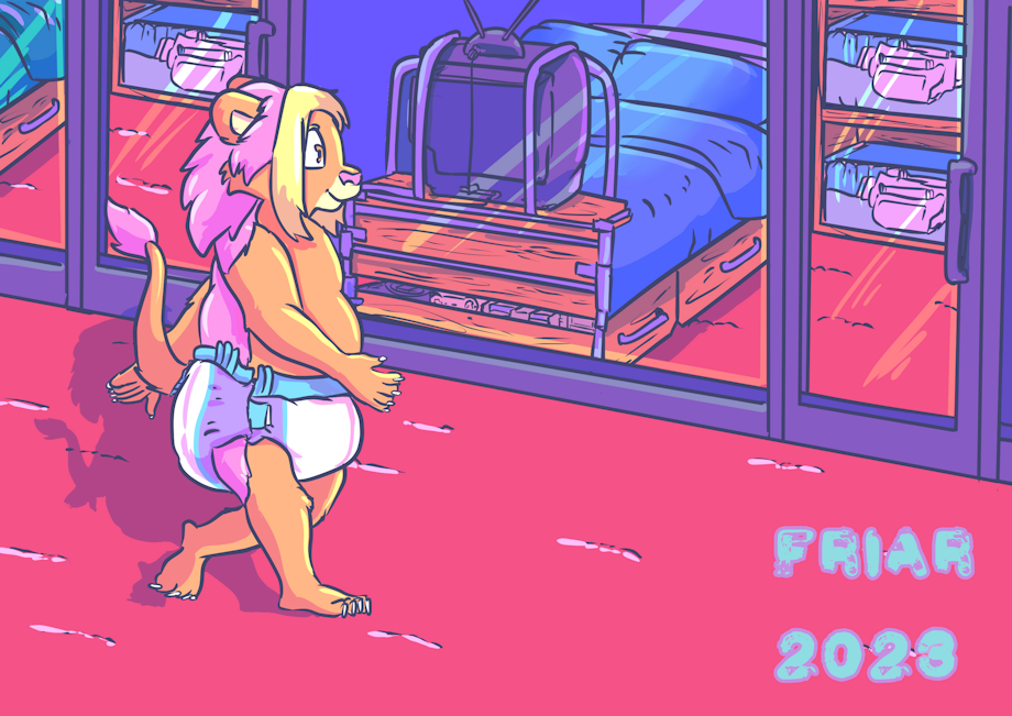 Illustration of Friar the wet and messy diapered lion walking through a dreamlike corridor containing repeating rooms containing a twin bed with poofy comforters, a CRT television affixed to bars at the foot of the bed, drawers under the bed containing a Sega Genesis and Super Nintendo, and a shelf containing packs of diapers. Each room appears with a clear glass wall visible on both sides, and a door one can enter from. The rooms appear identical in furnishings.