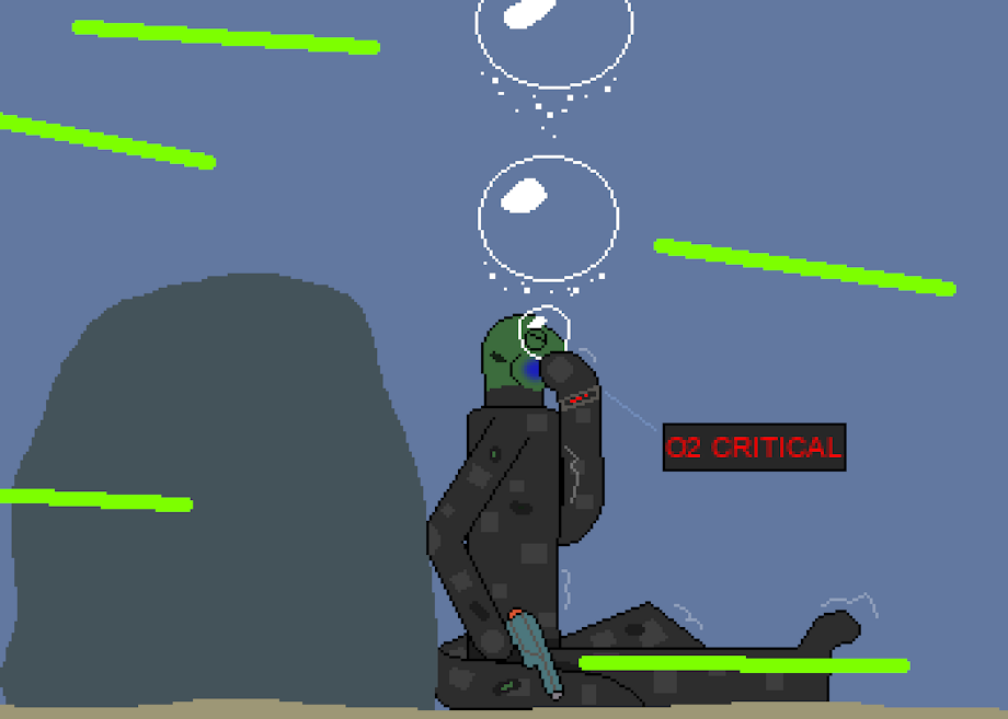 This lizard spy had been sent to get information on an underwater base, but he ended up overusing the invisibility field of his stealth suit and running out its battery right when he was in full view of a couple guards. In the ensuing escape, he lost the suit's hood, meaning he had to hold his breath once he got outside, and while he normally had an 8 minute hold and 90 second drown, that wasn't exactly how it'd be with his heart pounding the way it was. Now, he takes cover behind a large rock, pinned down by several aquatic guards' laser fire, only a couple shots left in his own laser pistol, and covering his mouth in an attempt to not inhale. There's no way he could reach the surface before drowning, and if he tried he'd just be finished off early. Things really couldn't be worse for him.