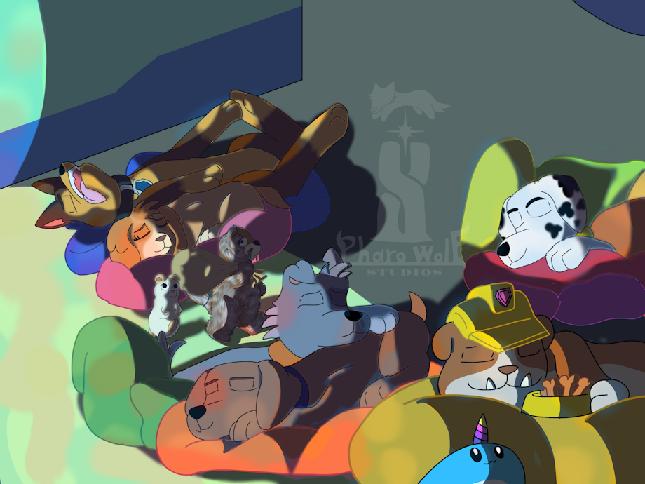 Había sido un día largo en Bahía aventura, tantos rescates habían hecho la jornada más atareada del año, sin embargo los miembros de paw patrol decidieron pasar la noche relajándose viendo una película, hasta que se quedaron dormidos.
