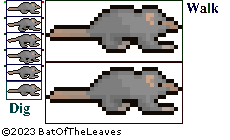 Page 1 is a crosspost of https://www.furaffinity.net/view/53640110/ which shows Jet, the father of my main character, flying. I am mainly showing off my idea for outlines on the sprites as I move this to Godot. While all of them are dark, they are not all plain black or gray and different characters or kinds of characters will have different outlines. Page 2 is a slowed down version of Page 1. Page 3 is a crosspost of https://www.furaffinity.net/view/53640247/ that shows the whole family of bats. Each with their own outline. Page 4 is a crosspost of https://www.furaffinity.net/view/53738101/ showing a couple of potential walk animations of my shrew character, as well as his digging and emerging animations. Page 5 is an earlier version of the animation used in page 4