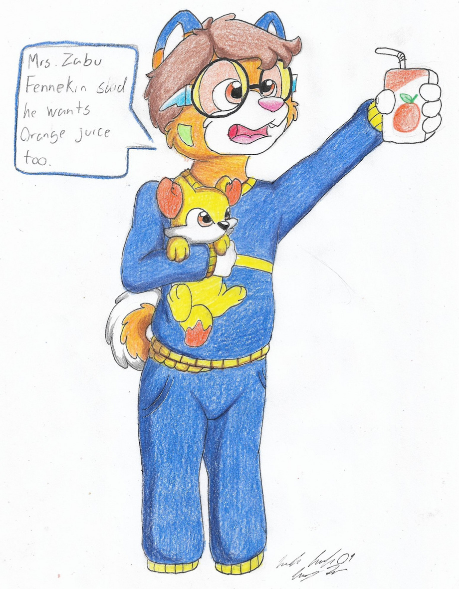 Just a cute drawing of pup Snowy asking Zabu if his plushy Fennekin can have orange juice too.