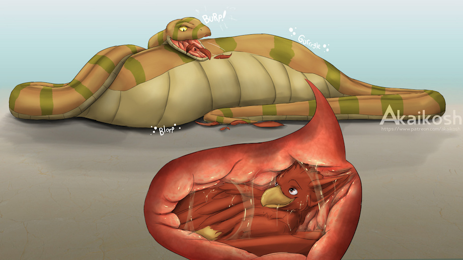 Commission for Zavvnao with their friend ConBadger; with the latter snug in the depths of the former's belly! Looks like they're enjoying the experience though, the muscular stomach walls holding them firmly in place as the belly grumbles hungrily around them.