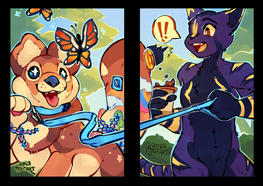 Double (Couple?) speedpaint portraits for fishyyllama! Pillowing and owner going for a beautiful morning walk, but suddenly.. A PAIR OF DANCING BUTTERFLIES?! One must give chase!