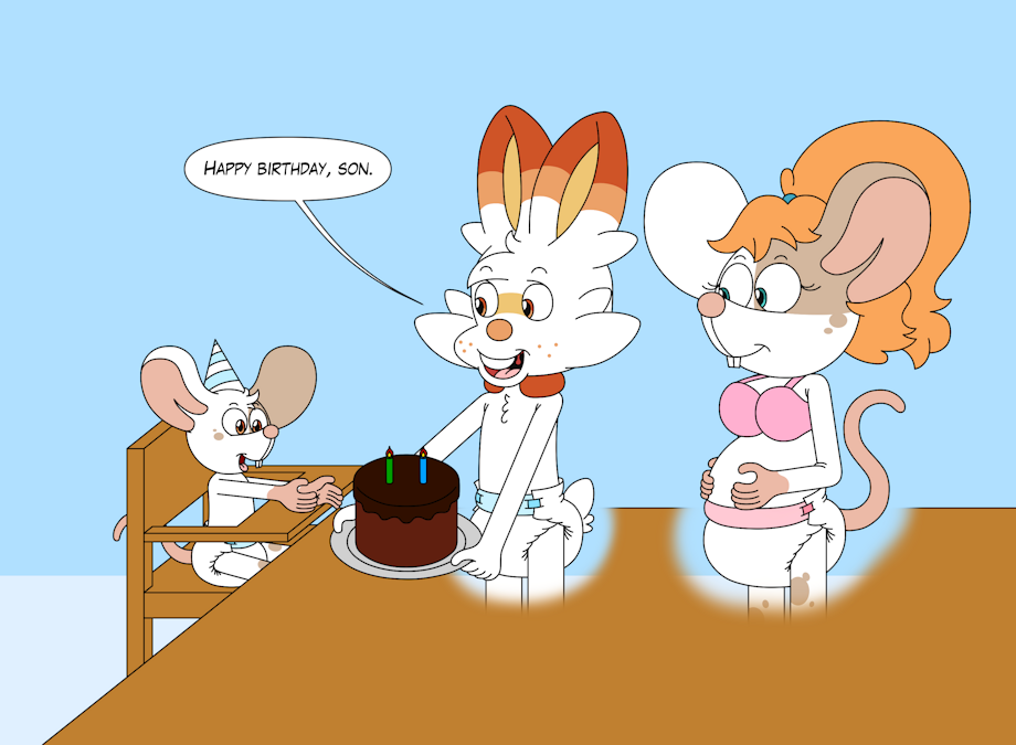 Today (September 24th, 2023), Marcus the Mouse celebrates his second birthday. His father Hoppy presents him a chocolate cake with two candles on it while his pregnant mother Maple watches.