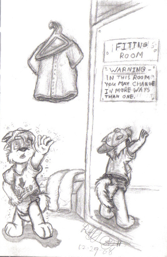 reflecting in the mirror below the fitting room sign was a warning . wich went as follows: IN THIS ROOM YOU MAY CHANGE IN MORE WAYS THAN ONE.